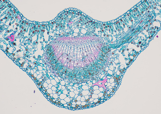 植物番红固绿染色,可用于观察植物组织的形态结构。韧皮部形成层,芽尖根尖分生区等新生组织结构呈绿色,木质化木栓化的结构呈红色(进行植物软化后的木质化结构成分流失,结果呈绿色)。